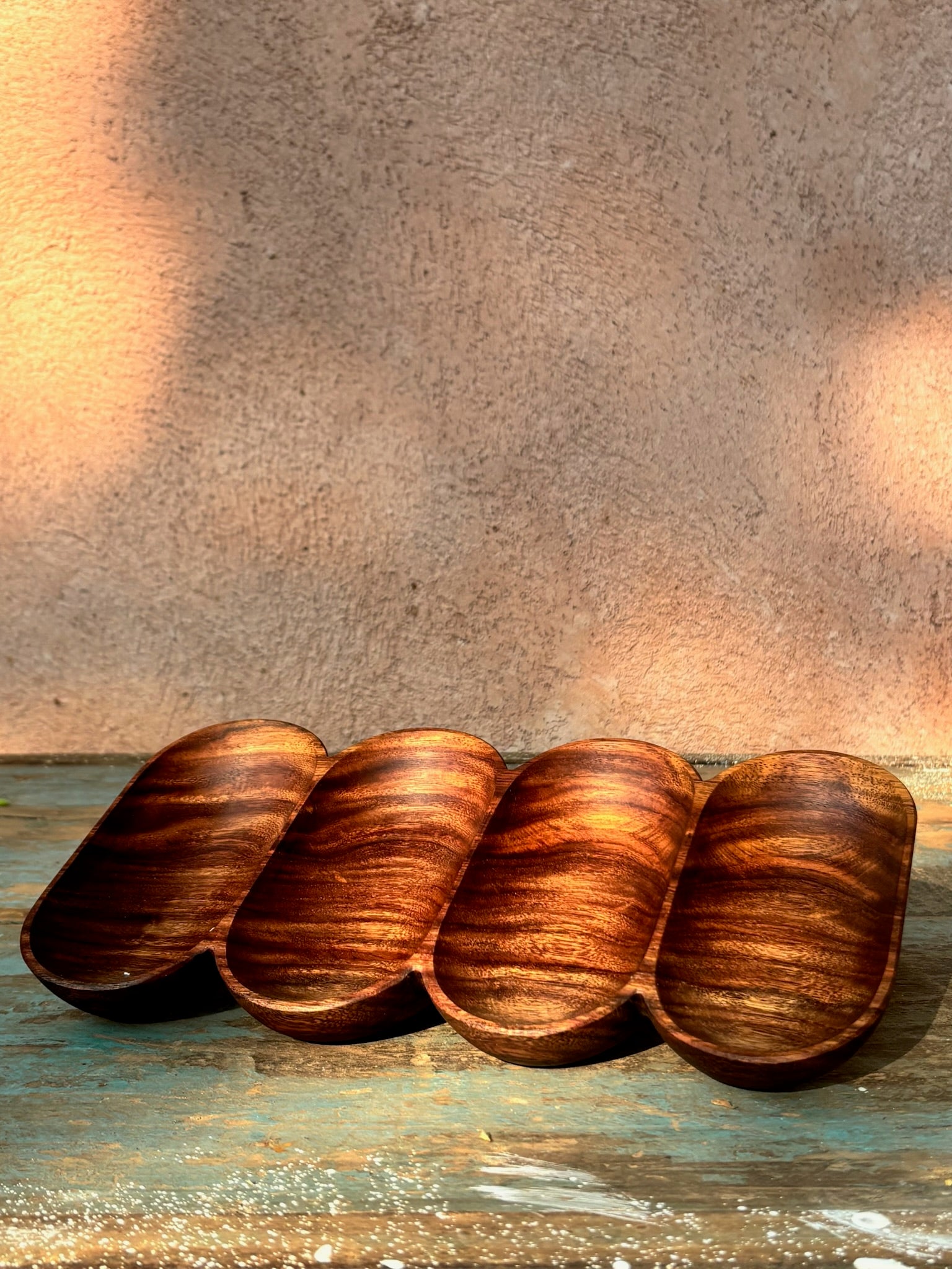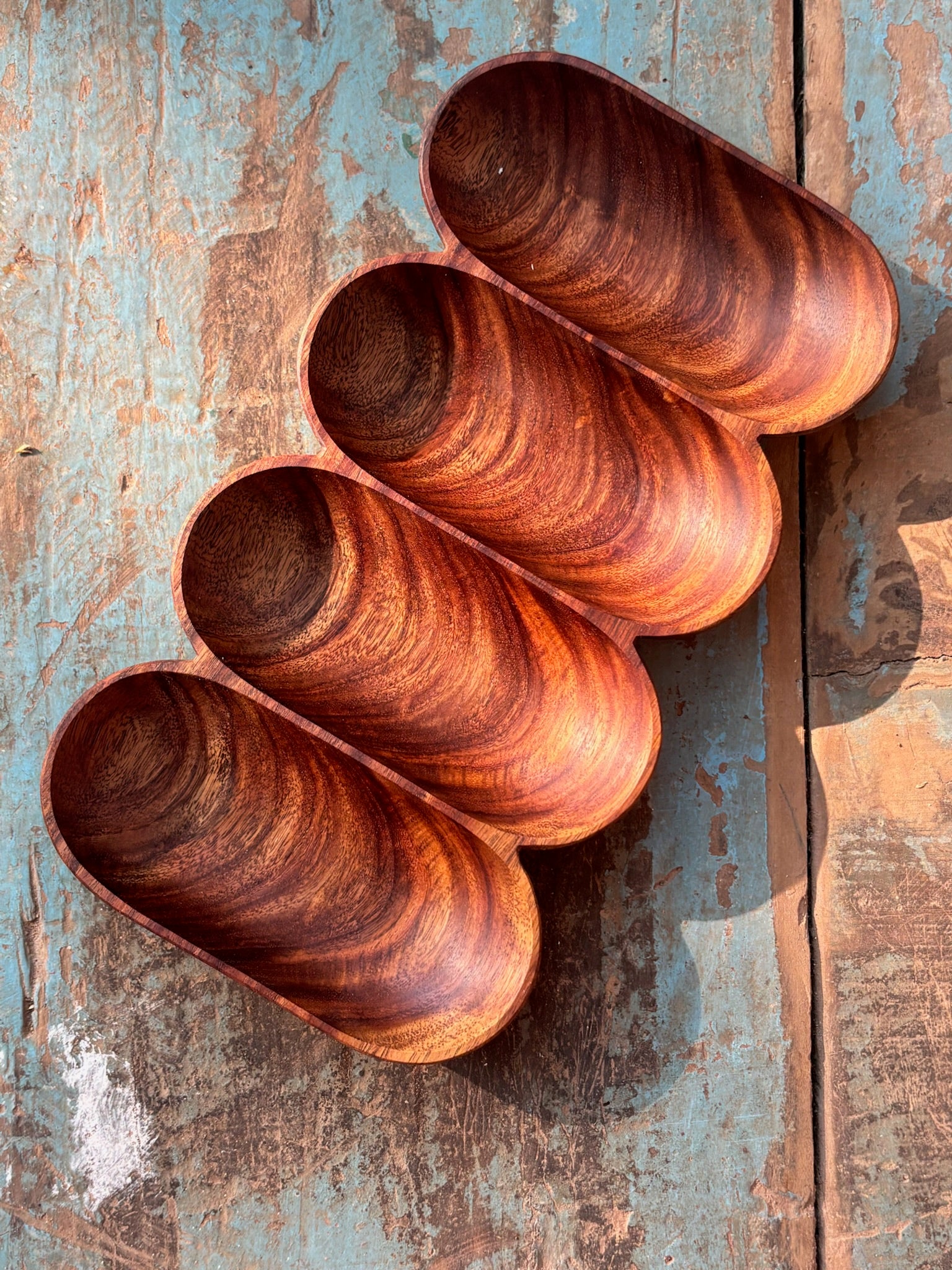 Made entirely by hand using a single piece of responsibly and locally sourced sheesham or Indian Rosewood (Dalbergia sissoo), the Olive Boat is a great way to serve olives and nuts. Once completed the craftsperson begins gently engraving and scooping out the patterns using hand tools, slowly drawing out the natural beauty of the grain. The raw piece is then sanded and polished using an edible linseed oil before it is left to dry naturally. Each piece is worked on over a period of days.
